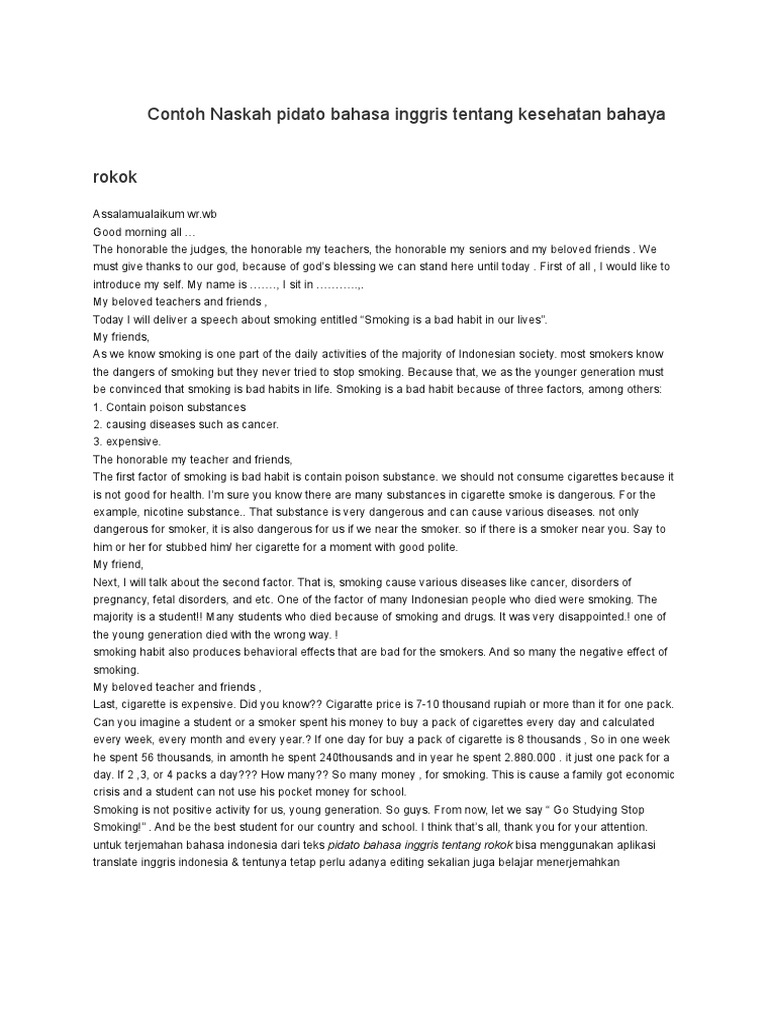 Contoh Naskah pidato bahasa inggris tentang kesehatan bahaya rokok.docx | Smoking | Tobacco Smoking