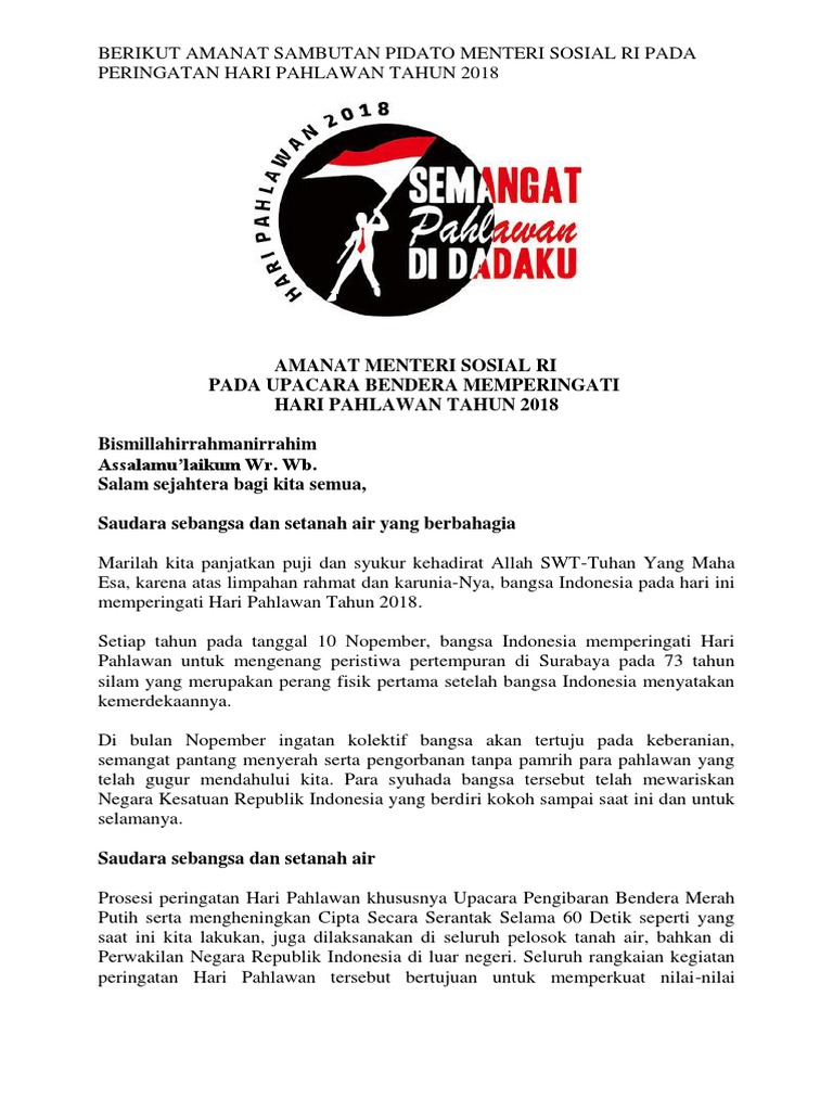 AMANAT SAMBUTAN PIDATO MENTERI SOSIAL RI PADA PERINGATAN HARI PAHLAWAN TAHUN 2018 - Bingkai Banua