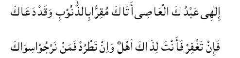 Ilahi lastu lil firdausi ahlaan Wa’ala Aqwa ‘alannaril jahiimi Fahabli taubatan waghfir dzunubi Fainnaka ghafirudz dzmbil ‘adziimi Dzunubi mitslu ‘adadirrimaali Fahabli taubatan ya dzal jalaali Wa ‘umrii naaqishun fii kulliyaumi Wa dzanbi