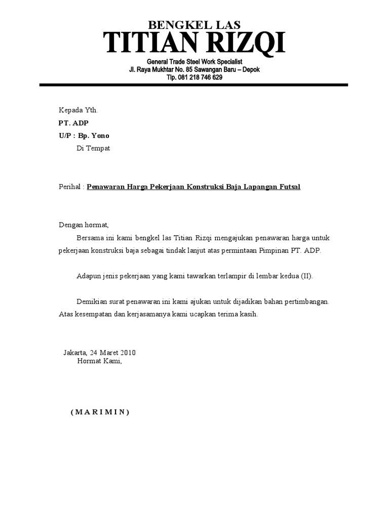 Contoh Surat Penawaran Harga Bengkel Las