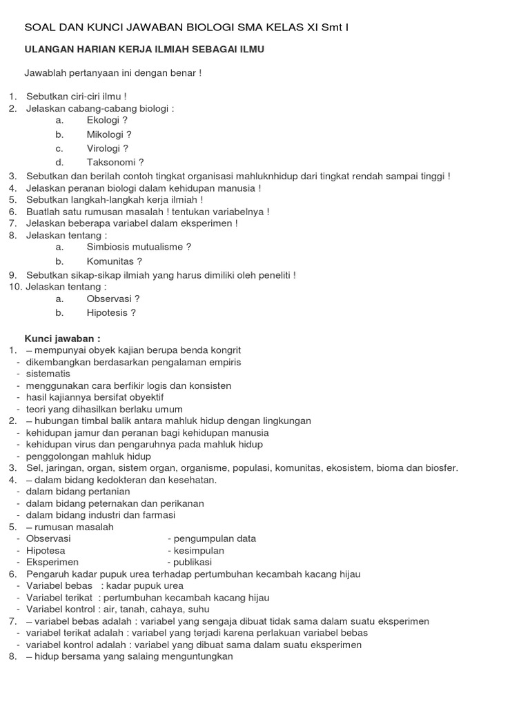 Soal Dan Kunci Jawaban Biologi Sma Kelas Xi Smt i