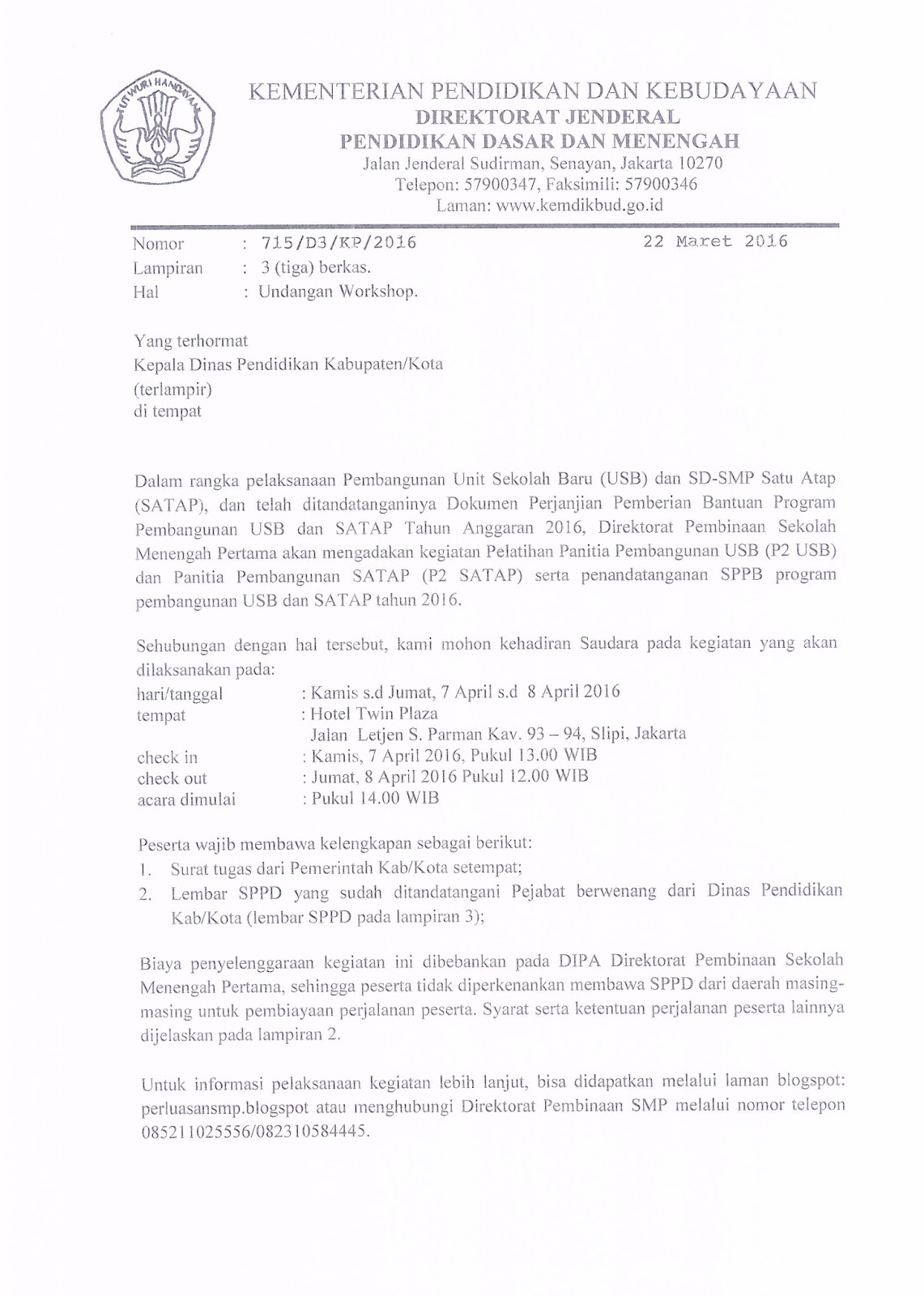Perluasan Akses SMP: Surat Undangan Pelatihan Panitian Pembangunan USB (P2USB) dan Panitia Pembangunan SATAP (P2SATAP) Lokasi Jakarta (Untuk Dinas)