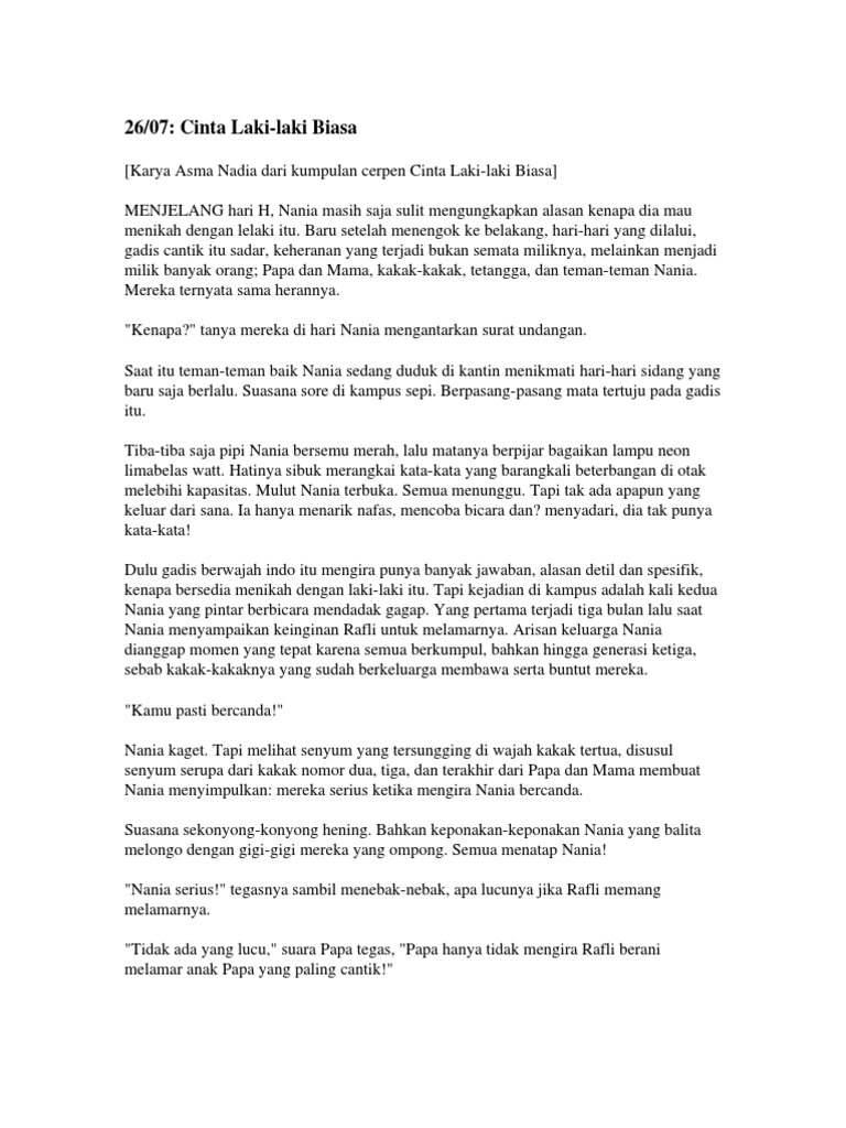 CINTA LAKI-LAKI BIASA Cerpen Asma Nadia Menjelang hari H, Nania masih saja sulit mengungkapkan alasan kenapa dia mau menikah den