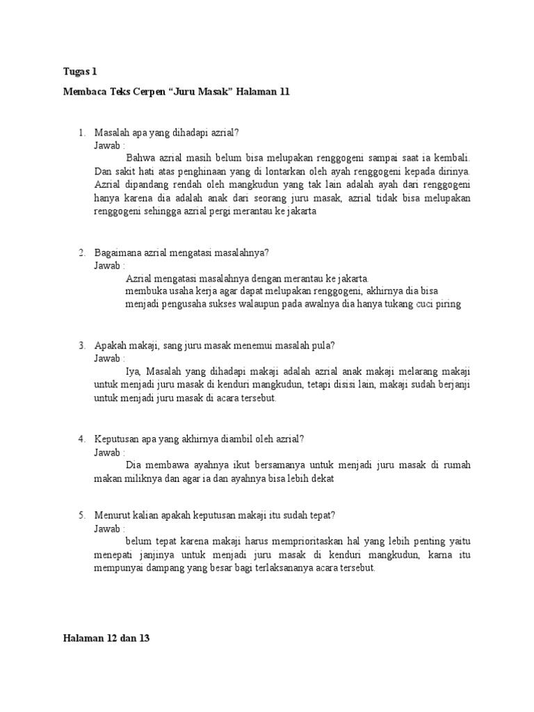 Pertanyaan dari Cerpen Juru Masak Bahasa Indonesia Semester I Kurikul…