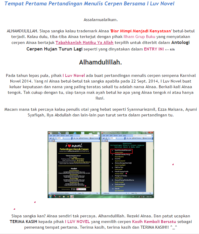 Tempat Pertama Pertandingan Menulis Cerpen Bersama I Luv Novel