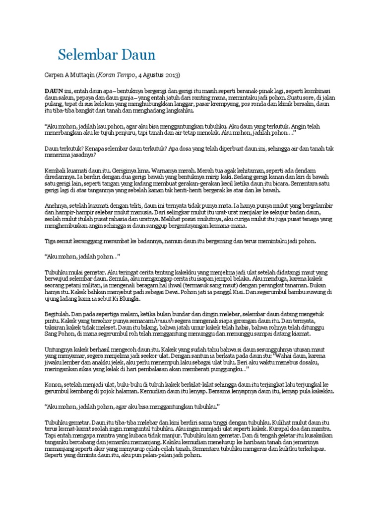 Selembar Daun: Cerpen A Muttaqin (Koran Tempo, 4 Agustus 2013)