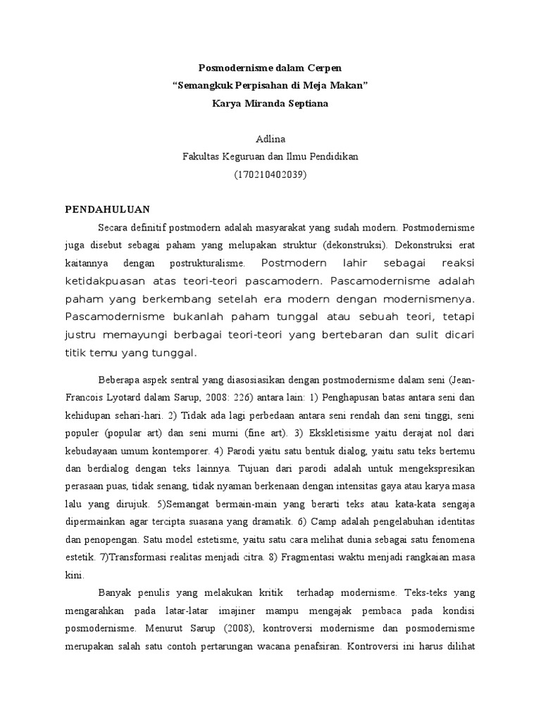 Posmodernisme dalam Cerpen “Semangkuk Perpisahan di Meja Makan” Karya Miranda Septiana