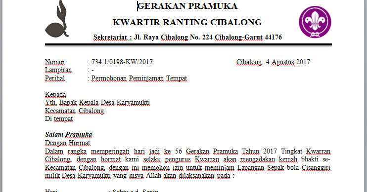 Contoh Surat Permohonan Peminjaman Tempat Untuk Kegiatan Kemah Pramuka
