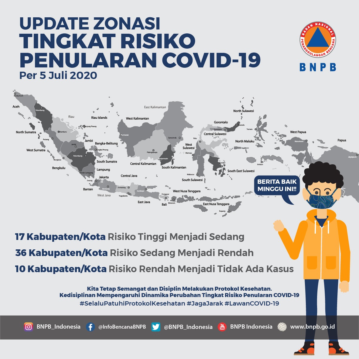 BNPB Indonesia: “Hai #SahabatTangguh melalui tim pakar, Gugus Tugas mengumumkan kembali perkembangan dan perubahan zona risiko penularan COVID-19 di wilayah administrasi Kabupaten dan Kota di Indonesia. #BersatuLawanCOVID19 …