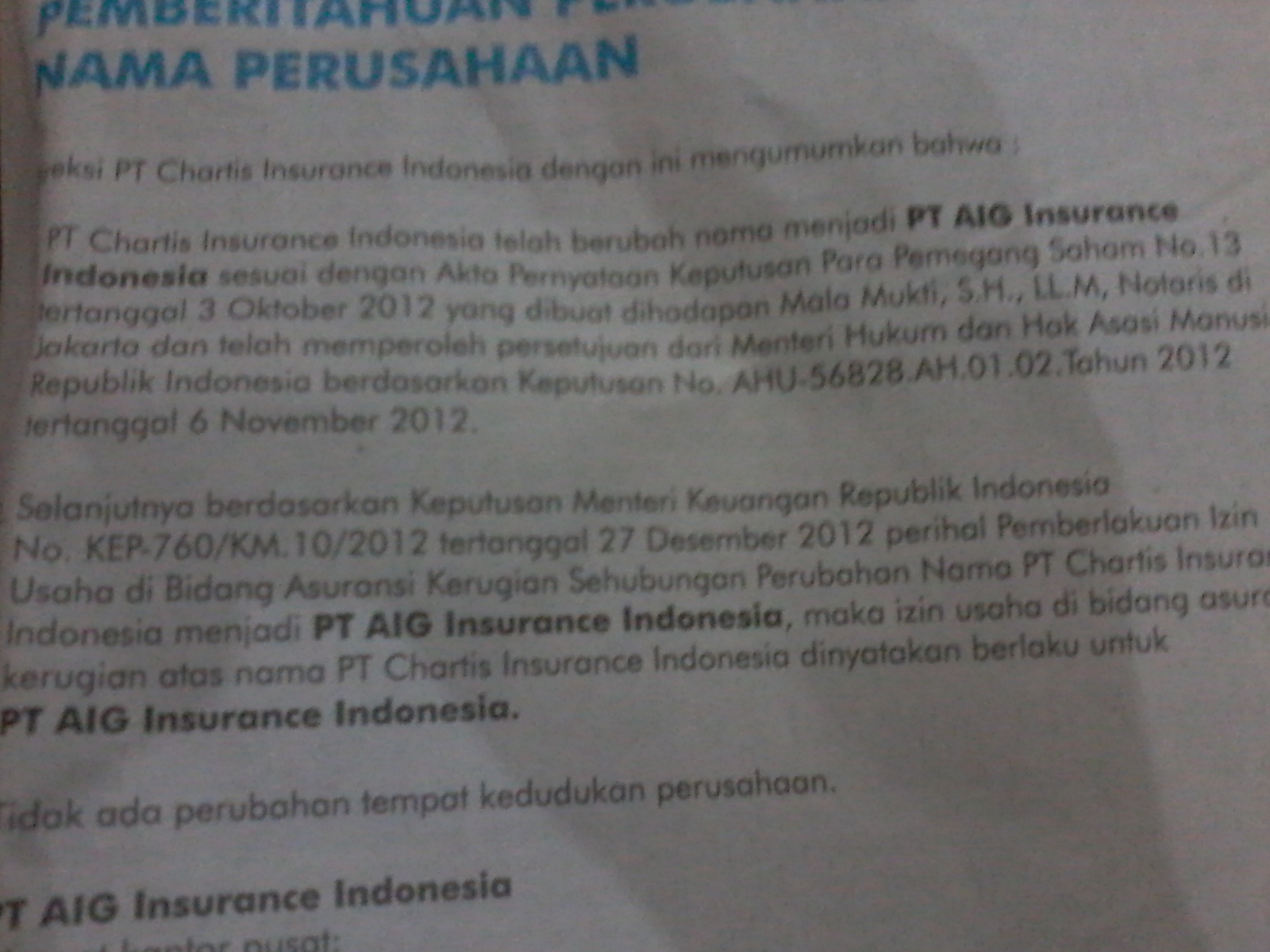 News Ekonomi: Perubahan nama Chartis Insurance Indonesia