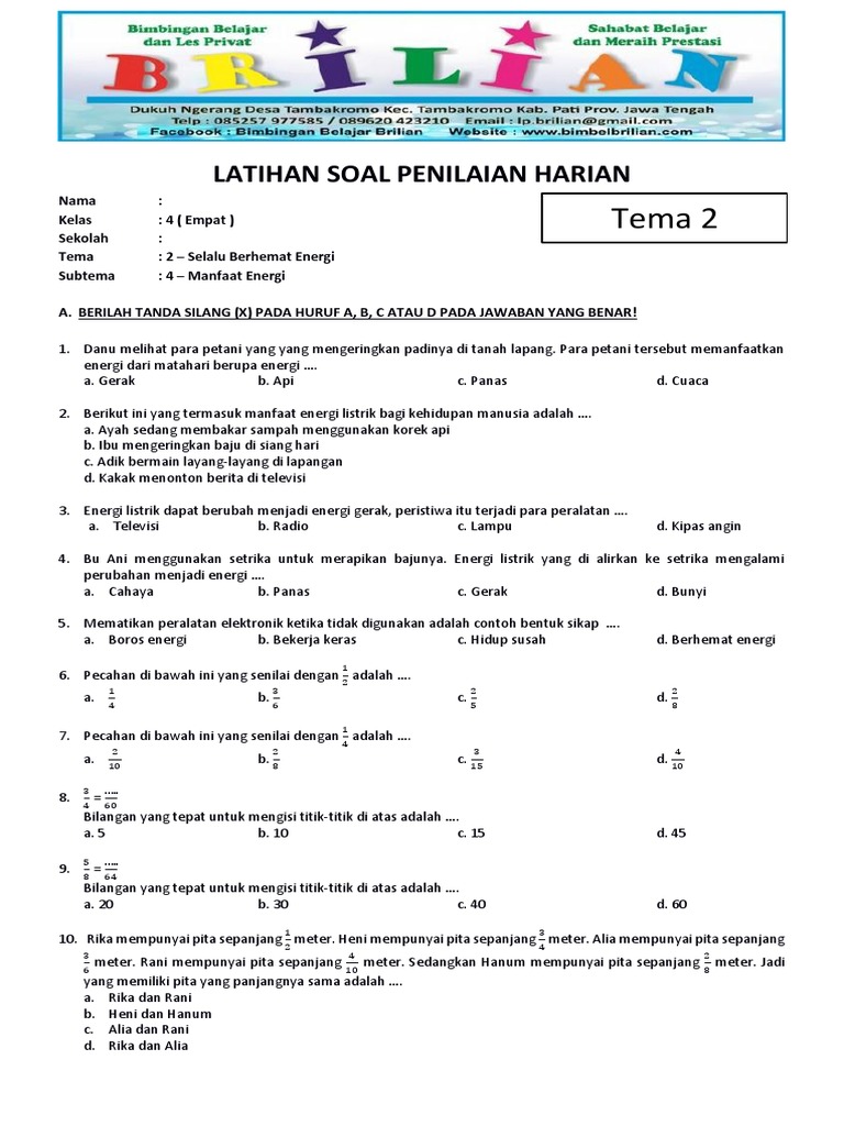 Soal Tematik Kelas 4 SD Tema 2 Subtema 2 Manfaat Energi Dan …