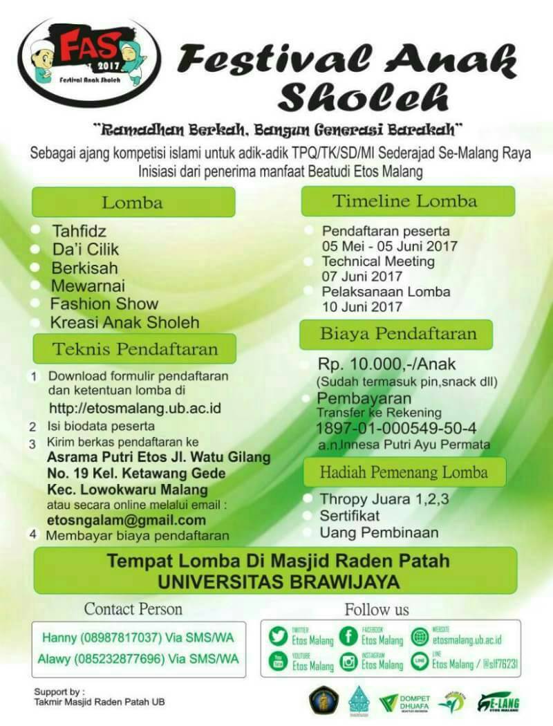 Lomba Tahfidz , Da’i, Berkisah, Mewarnai, Fashion Show, dan Kreasi Anak Soleh] Festival Anak Sholeh (FAS) 2017 - Info Lomba 2020 Terbaru