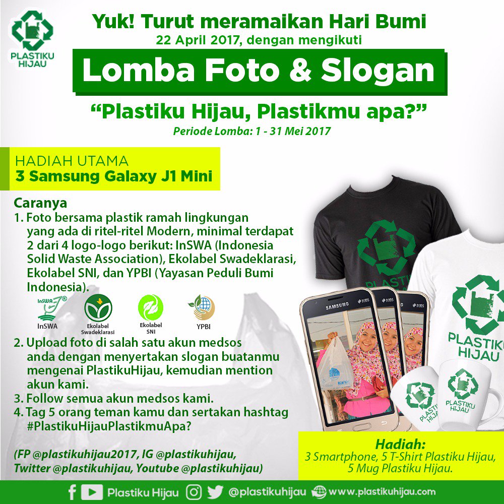 plastikuhijau: “Yuk, Turut Meramaikan Hari Bumi Dengan Mengikuti LOMBA FOTO & SLOGAN #Plastiku Hijau Plastikmu Apa ? Hadiah Utama 3 Samsung Galaxy J1… https://t.co/0f27tpfzwO”