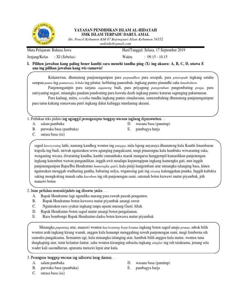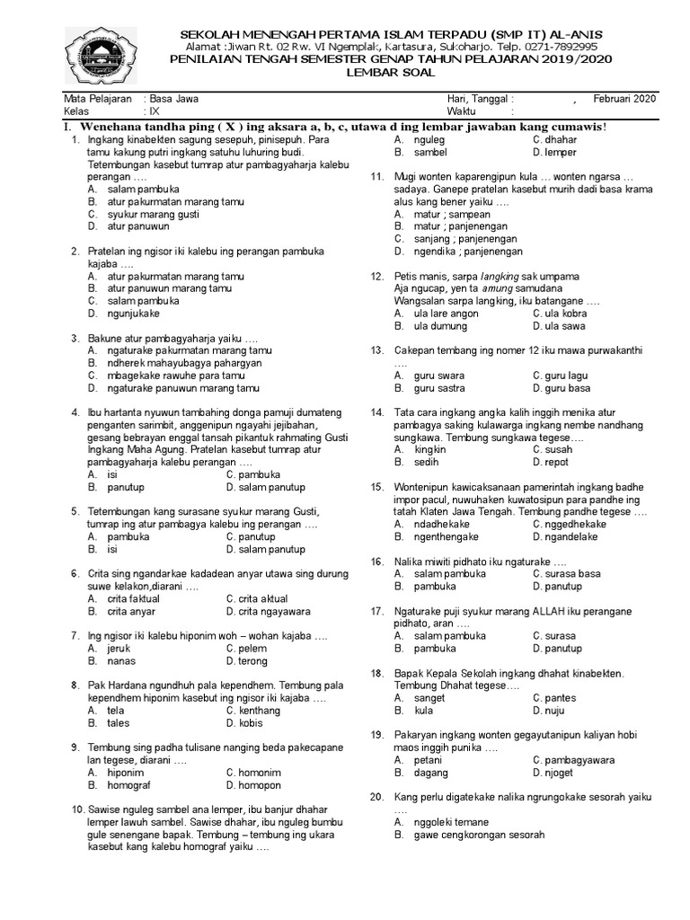 soal UAS Bahasa Jawa kelas 9 SMPMTS semester 1